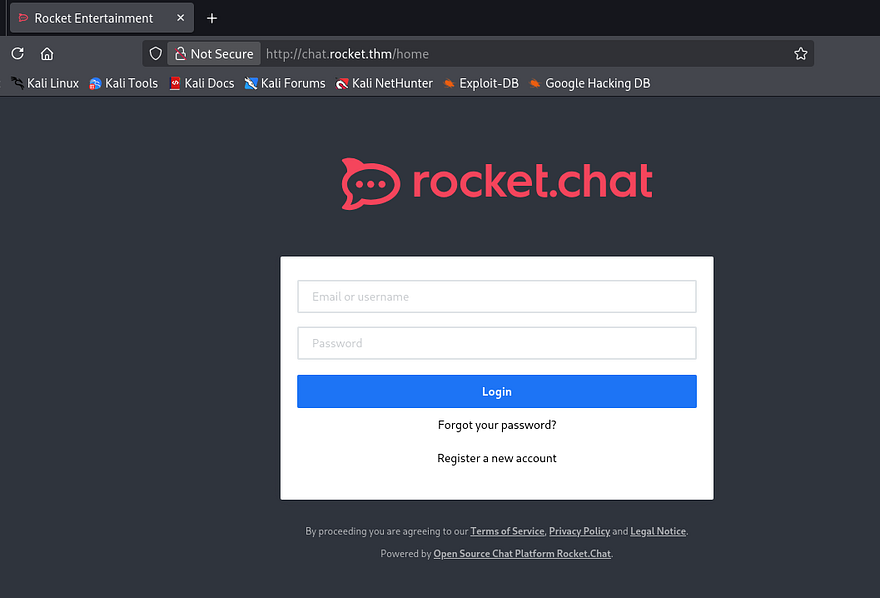 After adding that to my hosts file, I navigate to it and find a login panel for the rocket.chat application. This is actually a real open-source platform, not their own proprietary platform.