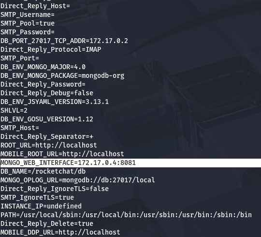 I use the env command to check the environment information, which discloses a MongoDB Web Interface running on port 8081. There’s not much else on the system for us so we’ll need a way to reach this from out attacking machine for more tools.