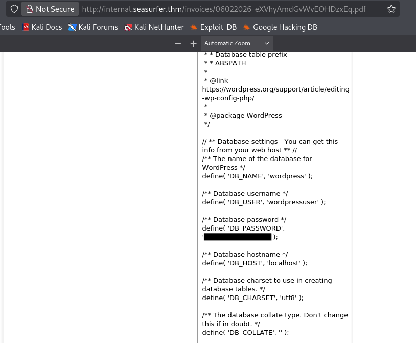 Just like internal enumeration when I get a shell as www-data, I’ll look for config files pertaining to the web server. Since this site’s on port 80, WP files will most likely be hosted in /var/www under a directory named something like Wordpress or website. I use the same exploit chain to test for files under that location and get a hit back from wp-config.php.