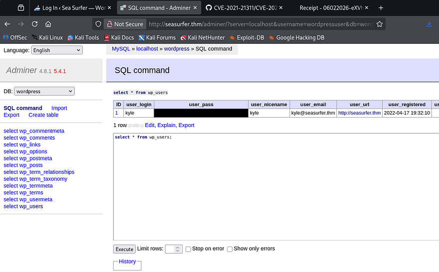 Heading back to the /adminer page allows us to login to the MySQL database using the wordpressuser credentials. I use the execute SQL command function to dump all contents from the wp_users table which grants me a hash for Kyle’s admin account.