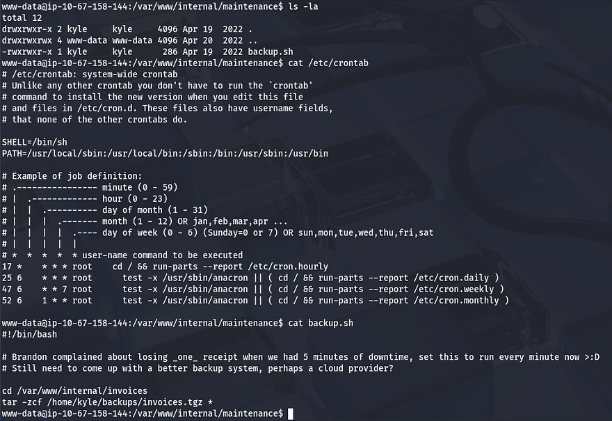 The backup script gets executed by Kyle every minute and is set to use the tar binary to zip all files within the invoices directory. The important thing to notice here is the wildcard operator at the end of the command, this will allow us to fabricate malicious filenames to pass into the binary in order to have it execute our reverse shell.