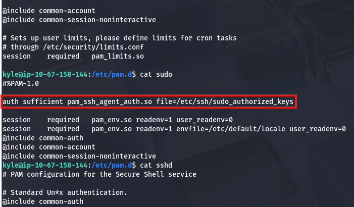 Parsing all files within the /pam.d directory shows that Sudo has been configured so that SSH keys are accepted.