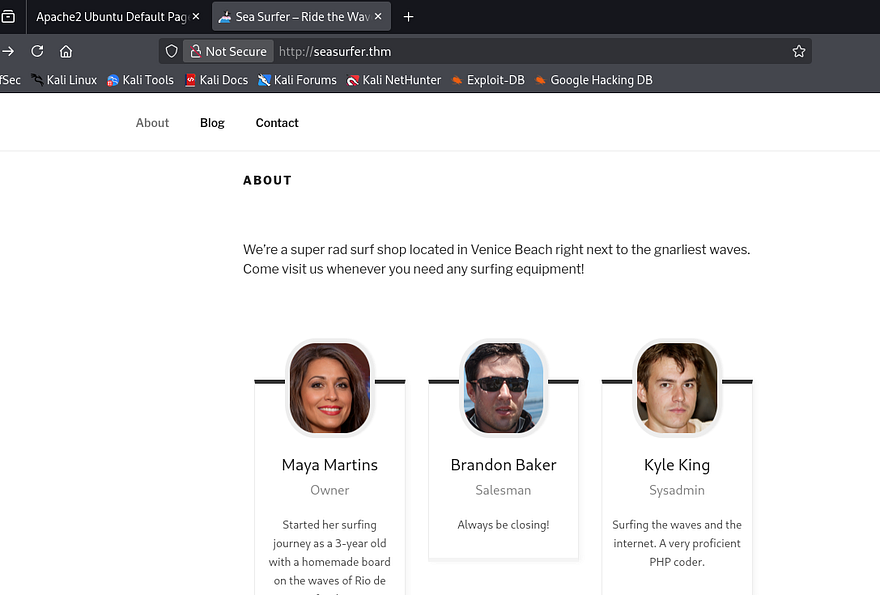 This looks to be a Surf shop’s website and a quick look at the footer/source code shows that it’s ran on Wordpress. Under the About tab is a small list of employees we can add to a username list in case a brute force is needed in the near future. Also, Kyle’s account is probably our golden ticket to a reverse shell as he is listed as the sysadmin. I take note that his description says he is an avid PHP coder, which makes me believe he might’ve written a custom API or page that is vulnerable.