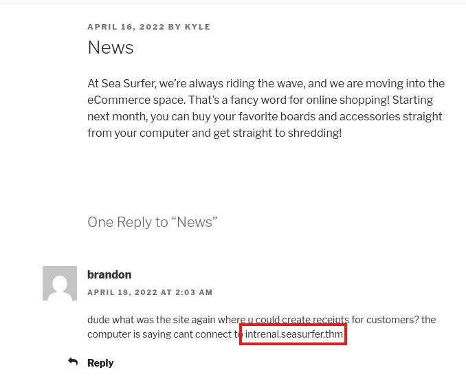 I discover this Python PoC which will allow us to make requests on behalf of the server to an internal web application, now all we need is somewhere to poke at. Restarting subdomain enumeration on this domain will give us another site at internal.seasurfer.thm, we can also find this in a comment left by Brandon on the News blog post. Let’s add that to our /etc/hosts file and check it out.