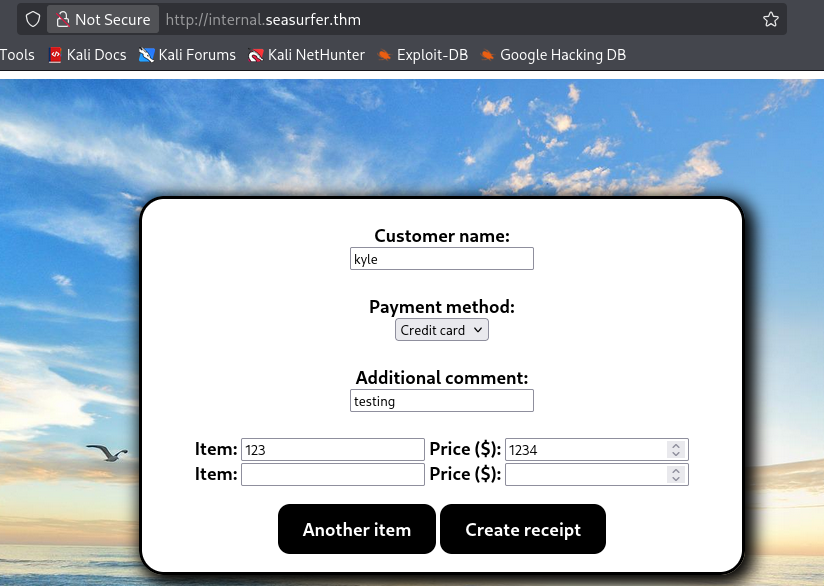 Judging by what Brandon’s comment said, this seems to be some kind of employee site dedicated to making customer receipts. The input form looks pretty old-school, so I submit some random values to test what gets done with them.