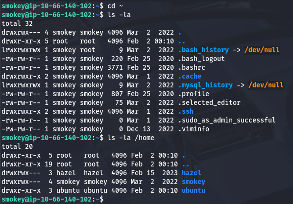 Now we can start looking at routes to escalate privileges to root user. Taking a quick look around shows that there is another user on the box named hazel. As we don’t have the user flag yet, we’ll probably need to pivot to her account and then onto root.