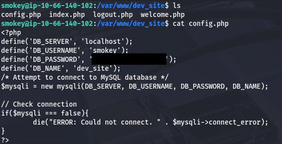 A bit of internal enumeration shows that there are a few websites and projects on the machine. Inside of the /var/www/dev_site directory is a config.php file which contains SQL credentials to login as smokey.