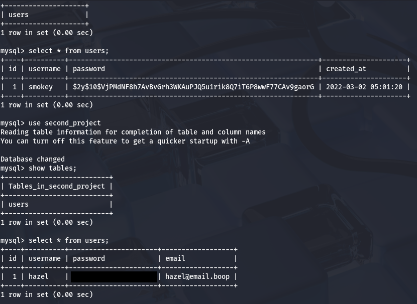 Dumping the dev_site database yields nothing but there is another DB named second_project. Dumping the users table from that one gives us Hazel’s password for a mysterious project she’s been working on. The contents of the password seemed like irony when it said something like ‘notmySSHpasswd’, but it really doesn’t work to login there.