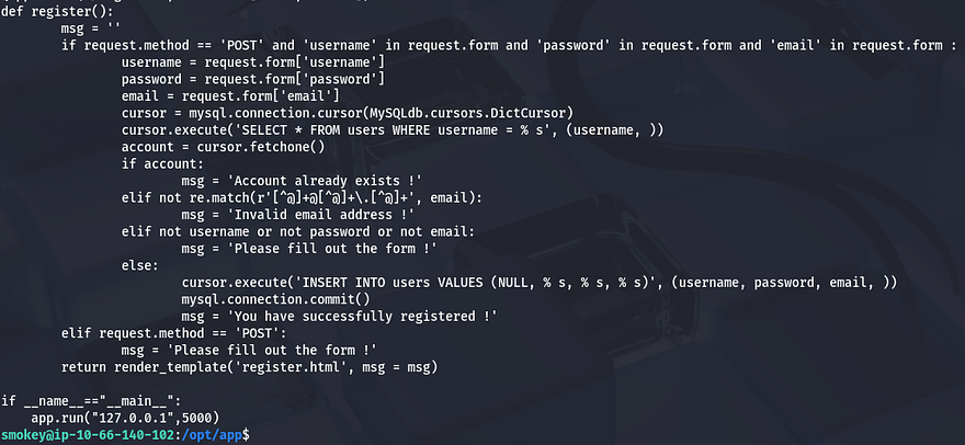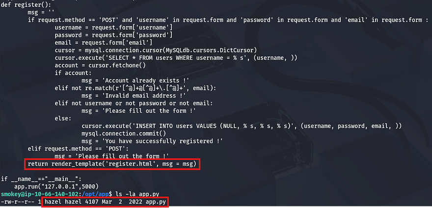 This site is located at /opt/app/app.py and we can see a register function that takes input provided from the user. This is pretty much the same thing we exploited as before, except for one detail. When the page is rendered, it takes the contents of register.html and displays it directly.