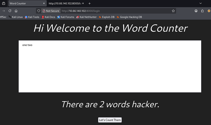 We do have a register account function, so I create a new account to enumerate the site internally. I discover a big query box that is used to count how many words are provided in the given text.