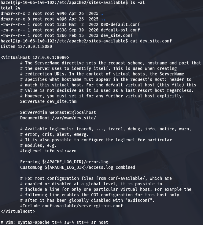 I check the Apache2 configuration files under /etc/apache2/sites-available/ to see what sites we have access to and find the dev_site once again. This application is running on localhost:8080 and we know is built on PHP.
