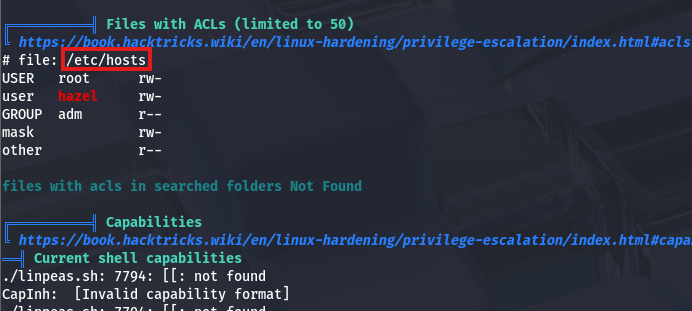 Parsing the output of that script shows that the /etc/hosts file has an access control list, which allows Hazel to read and write to it. Thinking back to the note left, I figured that somebody had to be logging into that site, maybe using a script to check its status or moderate it somehow.