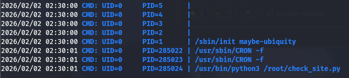 There were no active crontabs so I uploaded pspy to snoop around background processes and found that root was running a Python script to check the site every minute or so.