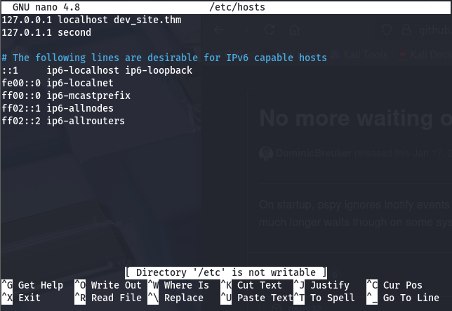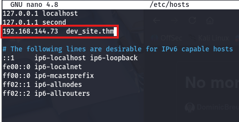 So how do we exploit this? Since we have the ability to change where the system will map IPs to the dev_site.thm domain, it’s possible to create a new line which redirects the dev site towards our own server hosted on an attacking machine.