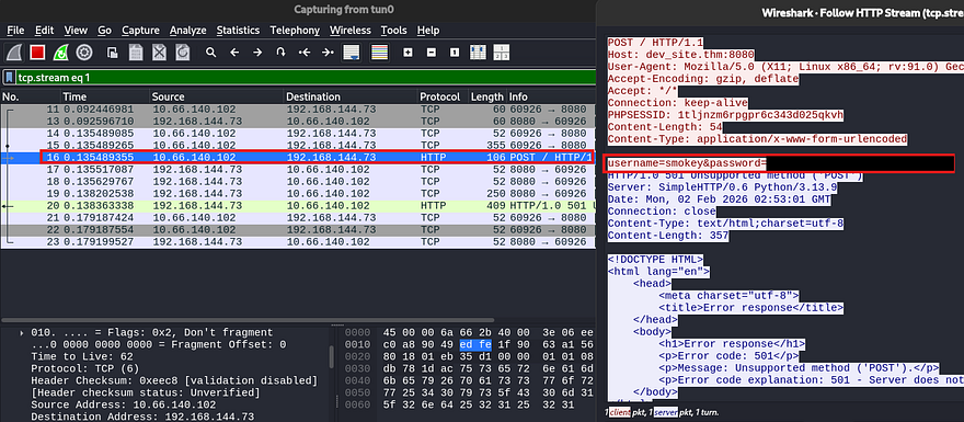 Since it’s using the CONNECT request method we need to capture traffic using a tool like Wireshark. We’re looking for a POST request sent from the servers IP. After finding it, I hit follow HTTP stream to see what data was sent and find basic auth credentials for smokey’s account.