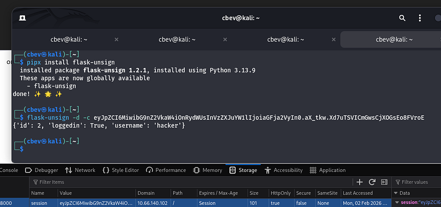 We’ll most likely have to exploit this built-in function to read sensitive info, get remote command execution, or dump a database through a malicious payload. I was curious as to what the session cookie resolved to so I utilized the flask-unsign tool to read it, which displayed a few parameters including our username.