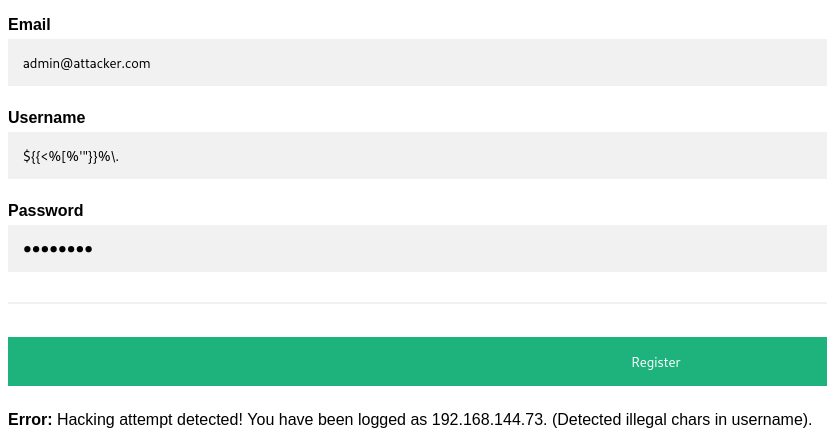 Error: Hacking attempt detected! You have been logged as ATTACKER_IP. (Detected illegal chars in username).