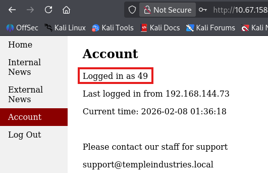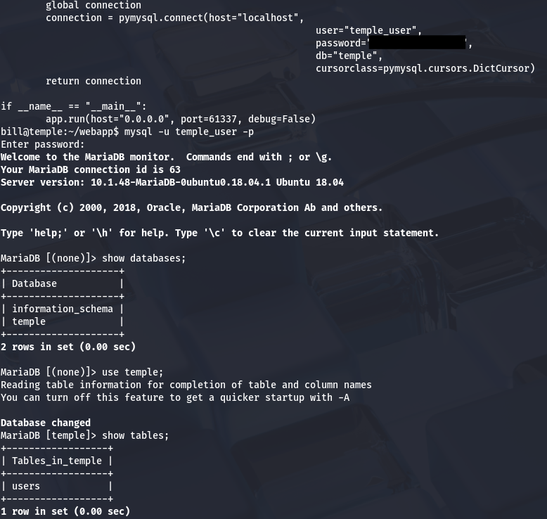 Displaying the webapp’s code shows MariaDB credentials for temple_user on the system which we can use to dump the database. This gives us a hash for the admin user but it doesn’t end up cracking.
