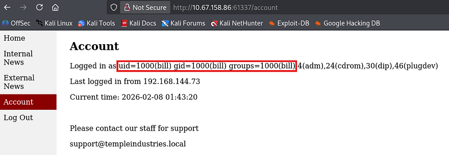 After logging in, we can see that the id command is executed confirming we have RCE on the system via SSTI. Since this application is on a non-standard port and isn’t using something like Apache, the server is being ran by Bill’s account. This is nice because once we grab a shell, there’s no need to enumerate the system as www-data or another service account.