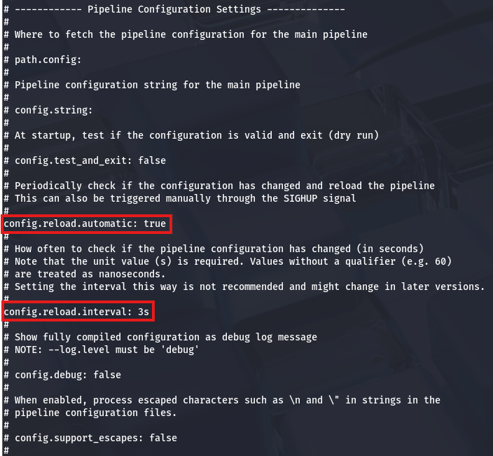 We don’t have the direct ability to restart the service on our own, but checking the pipeline’s YAML file (at /etc/logstash/pipelines.yml) for config settings shows that the automatic reload feature is enabled and set to go off every three seconds.
