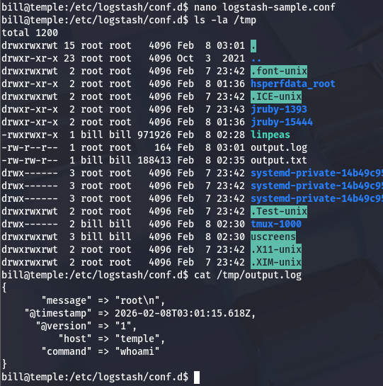 This service will effectively let us schedule commands to be executed by root user whenever we want by altering the logstash-sample.conf file. As a test run, I’ll use a simple whoami command to confirm we’re able to do so.