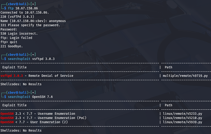 Moving on to FTP, it seems like anonymous logins have been disabled meaning we can’t really do anything here without credentials to sign in or a username to brute force. Same goes for SSH, and both of these versions gathered from Nmap’s default scripts are not vulnerable to anything too crazy.