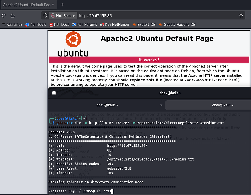 Checking out the landing page on port 80 shows the boilerplate Apache template for all new servers. There’s nothing on robots.txt so I’ll just leave a Gobuster scan running in the background to find potential subdirectories.