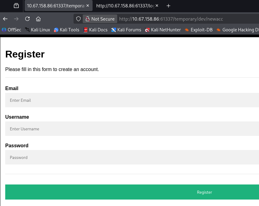 Checking out this page shows a forgotten account register page that the site developers probably used for testing the application. First I’ll make a new account to test if this actually works or is just leftover HTML.
