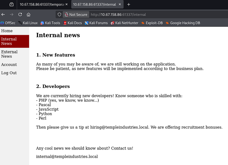It’s a success! Logging in with our new account displays a few new tabs to check out which discloses the organization’s email structure. This is cool and all but there really aren’t any functions to exploit included internally.