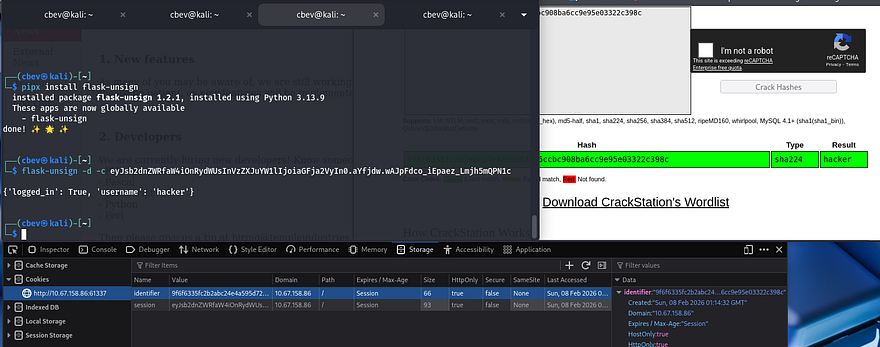 I was curious how the app kept track of our logins so I checked the cookies assigned. The first is an identifier, which is a SHA224 hash of our username. The second is a Flask cookie that retained the logged_in and username fields. We won’t be able to impersonate anyone unless we find the signing secret so this is out of the question.