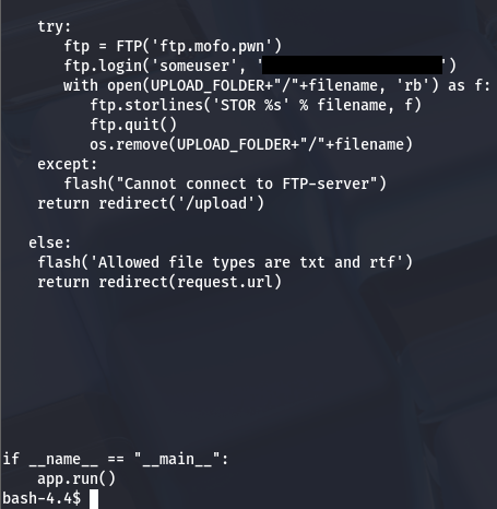 I also take a look inside main.py for any hardcoded creds and to my luck, I find an FTP login for ‘someuser’ at ftp.mofo.pwn.
