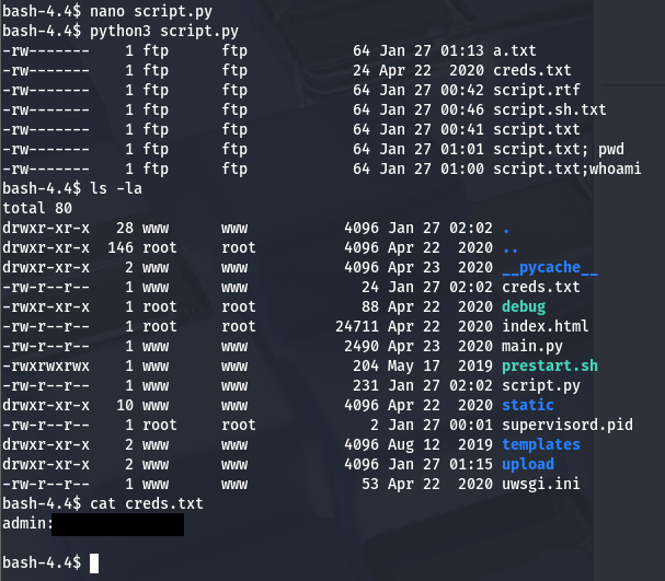 There is a creds.txt file, that was not uploaded by me. Hopefully this will contain some juicy SSH credentials for us. To retrieve this, I update my script to contain some lines to write the file as bytes and put it on our current dir:
