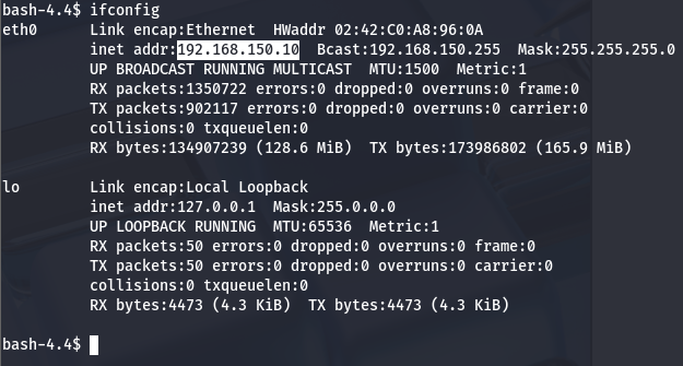 These are most likely used for the Docker container and not root’s password so let’s begin enumerating where we are. Ifconfig shows us another host located at 192.168.150.10.
