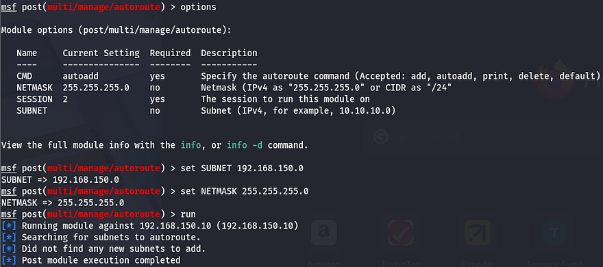 First, I autoroute the subnet using /post/multi/manage/autoroute while setting the subnet to 192.168.150.0 and the session to our one up on the Docker container.