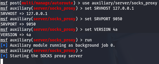 Then, I set up a proxy chain using the /auxiliary/server/socks_proxy module to be able to run Nmap against that subnet and find out more info.