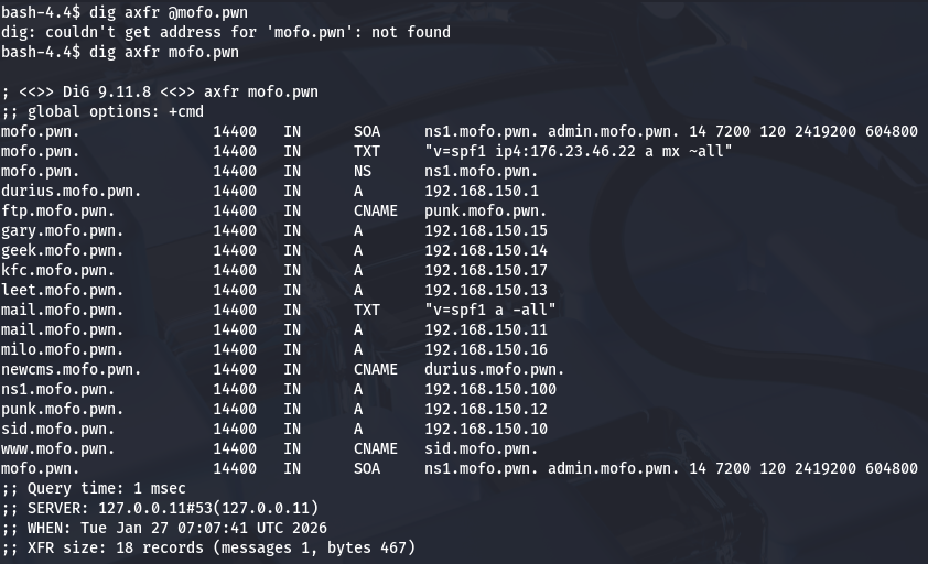 Looking at the DNS zone transfer contents displays two other subdomains with CNAME records. I doubt www has one because it is exposed to the web and we already enumerated ftp, so let’s check out newcms.mofo.pwn.