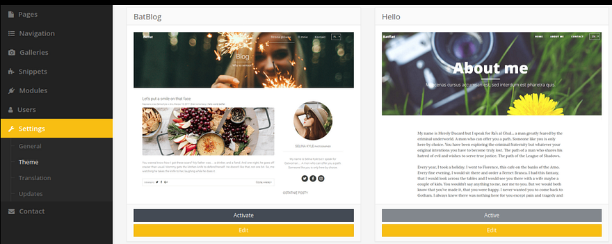 Looks like your run of the mill CMS and we already have access to the settings tab which will let us change a theme’s source code. To get a reverse shell on this host, I use Pentestmonkey’s PHP reverse shell and replace the blog.html template with our malicious code.