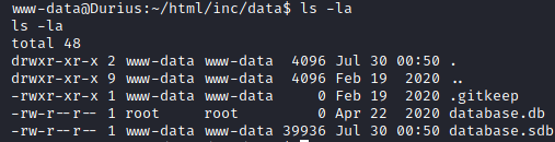 Let’s begin looking at routes for privilege escalation. I check for the typical SUID bits set, loose sudo privs, and backups laying around in /var, but find nothing of importance. Checking the html data for the website gives us a few database files to play around with.