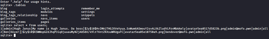 We can dump the contents of database.sdb (not the first one because its size is 0) by transfering it to our attacking machine with something like netcat. I use sqlite3 here and select all from the users table.