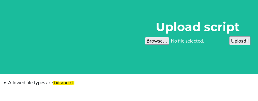 I capture a request while uploading a test script and find that the server only allows for .txt and .rtf files.