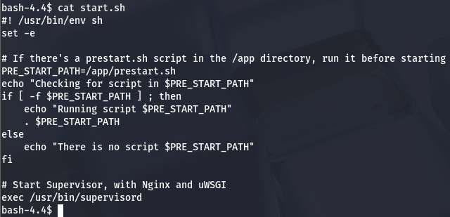 There is also a start.sh script which denotes that if there is a prestart.sh script in /app, it will run it before carrying on. This script is used to start a hypersvisor using nginx and a uWSGI (serves as a web server gateway interface for Python application).